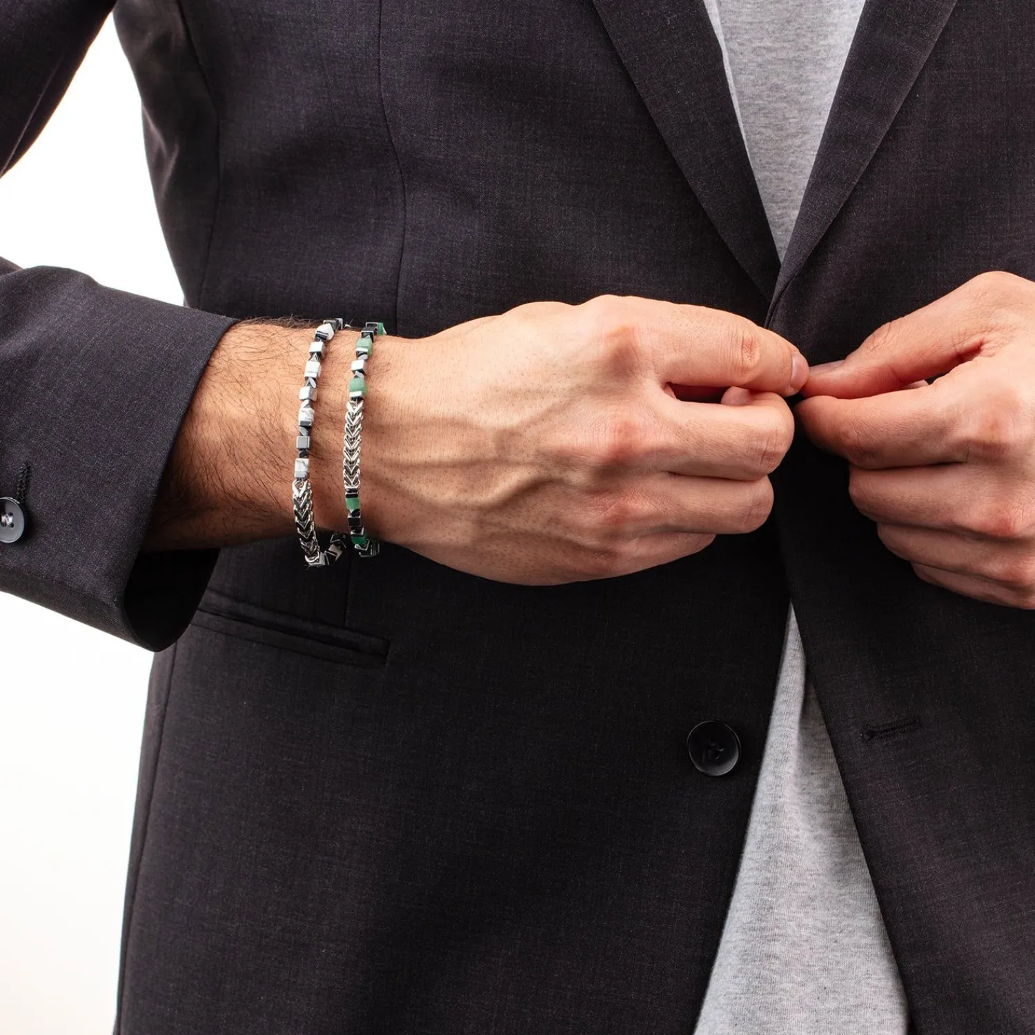 Die kostbaren Würfel Das Kettenarmband in Weiß und Silber ist ein Meisterwerk minimalistischen Designs. Glatte Howlith-Würfel und schimmerndes Hämatit mit Titanoxid-Finish spielen mit der Raffinesse einer geflochtenen Edelstahlkette. Dieses Schmuckstück ist der Inbegriff dezenter Eleganz und perfekt für den Mann, der die schönen Dinge im Leben schätzt.