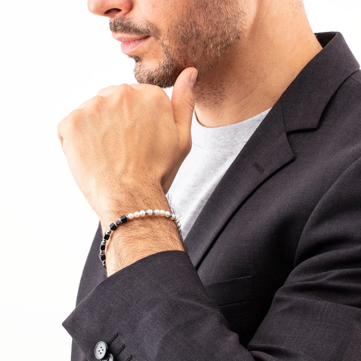 Das schwarze Precious Fusion Pearls-Armband ist ein Statement der Raffinesse. Matte Onyxwürfel, die Schutz und Stärke symbolisieren, sind kunstvoll mit schillernden Kristallperlen von Swarovski® verbunden. Der starke, längenverstellbare Karabinerverschluss aus Edelstahl unterstreicht den robusten Charakter des Mannes, während das asymmetrische Design für ein unverwechselbares Flair sorgt.