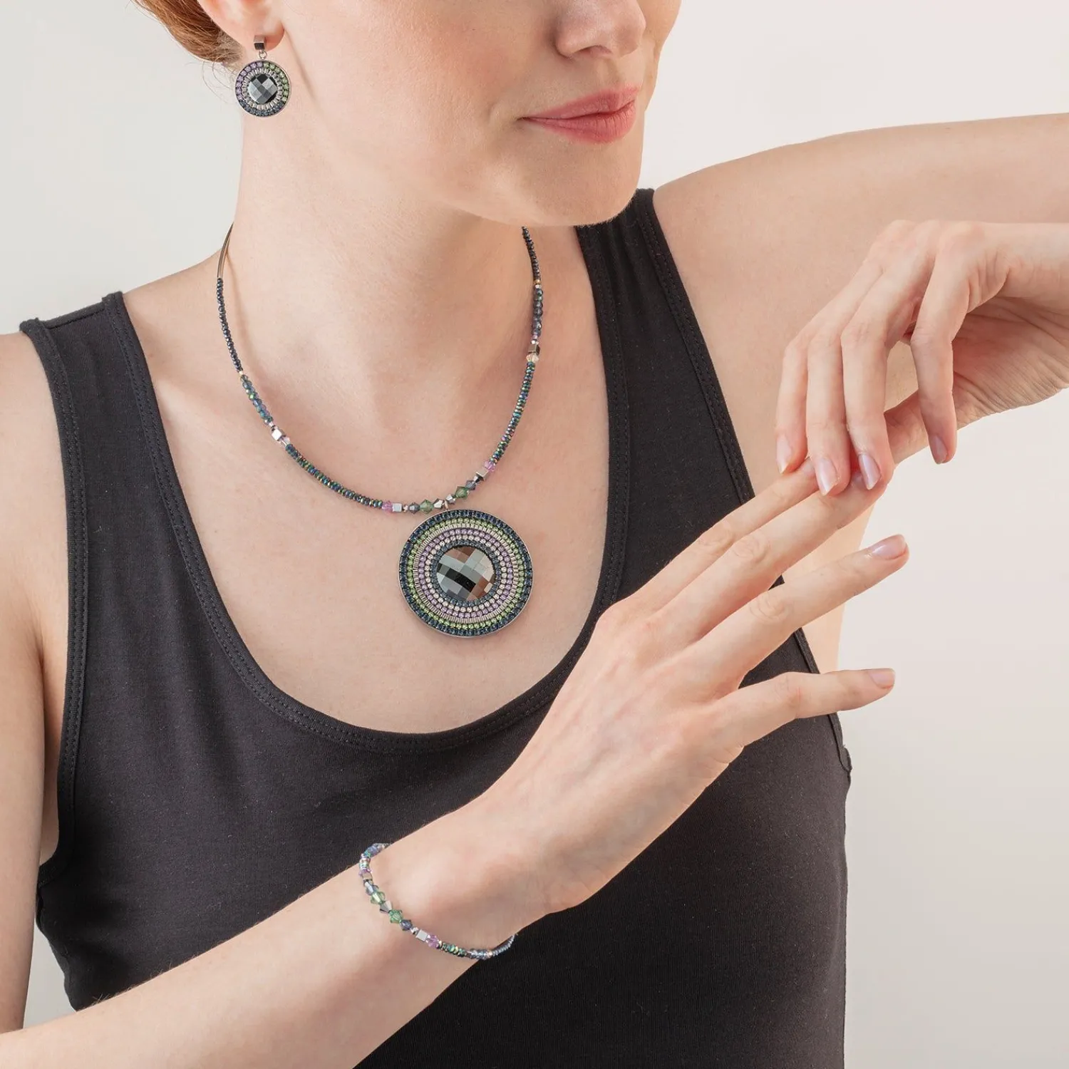 Inspiriert von mystischen Farbspielen verleiht dieser funkelnde Anhänger jedem Outfit einen Hauch von Extravaganz. Schimmernde Kristalle in Anthrazit, Blau, Grün und Flieder sind mit facettiertem Hämatit gepaart, fangen das Licht elegant ein und verleihen dieser Kreation ein außergewöhnliches Funkeln. Erhältlich als Set mit passendem Armband und Ohrringen für glamouröse Anlässe.