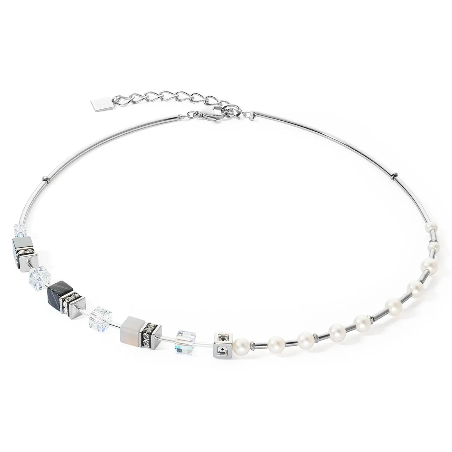 COEUR DE LION Halskette Geocube® Fusion Precious Pearl Mix Silbergrau- Echter Stein