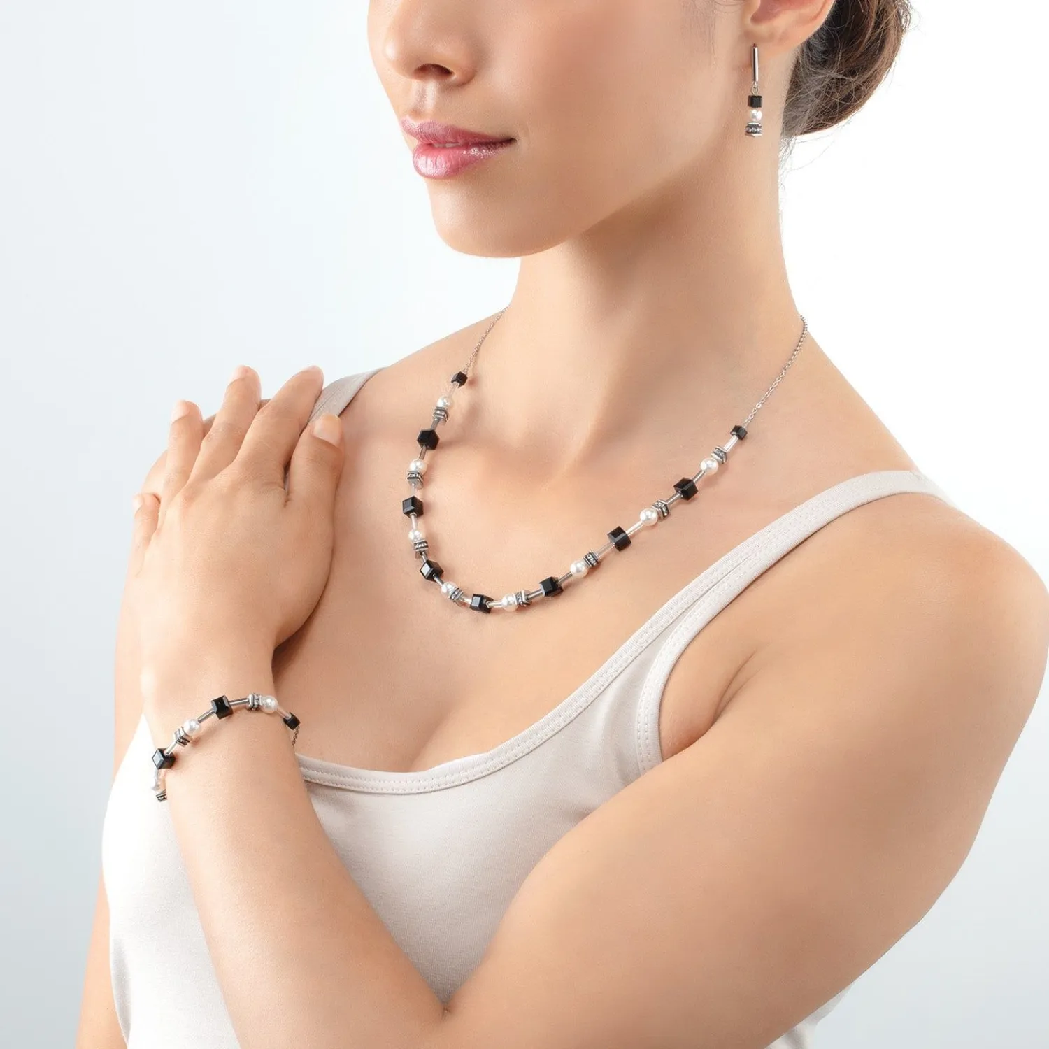 Atemberaubende geheimnisvolle Würfel Perlen! Zeitlose, elegante schwarze Swarovski®-Kristalle werden mit raffinierten Kristallperlen kombiniert, um einen dramatischen Effekt zu erzielen. Die Länge kann durch den praktischen Schiebeverschluss individuell angepasst werden. Ideal zum Schichten. Ergänzen Sie diesen Stil mit den Mysterious Cubes Armband und Ohrringe aus Perlen, Silber und Schwarz.