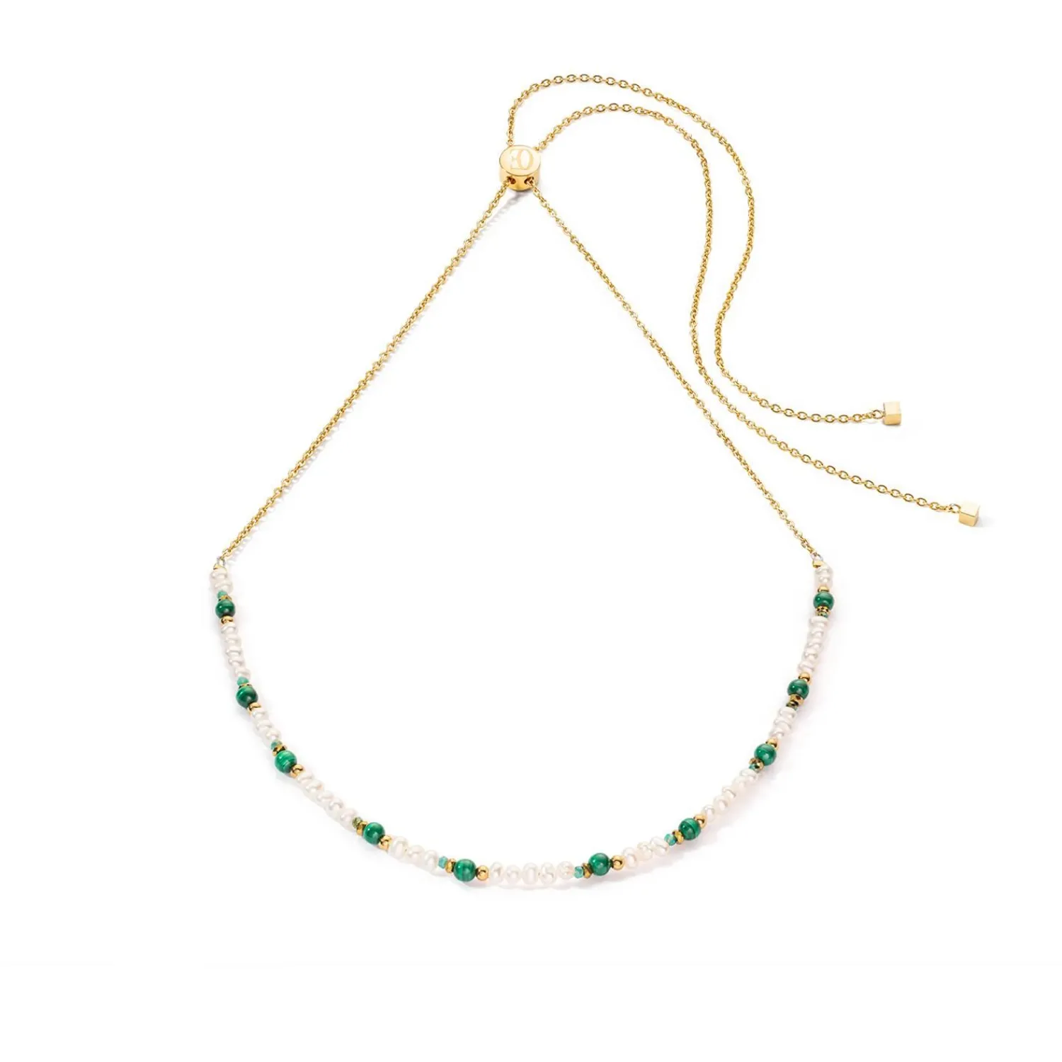 Diese zarte Halskette aus unserer Pearl Edition besteht aus echten Süßwasserperlen, die mit klärendem grünem Malachit gepaart sind. Der praktische Schiebeverschluss ermöglicht es Ihnen, die Halskette an die von Ihnen gewählte Länge anzupassen. Das bedeutet auch, dass Sie es auf verschiedene Arten tragen können – als Halsband, als moderne, kurze Halskette oder in klassischer Standardlänge. Ideal kombinierbar mit anderen Coeur de Lion-Halsketten für einen modischen Lagenlook.