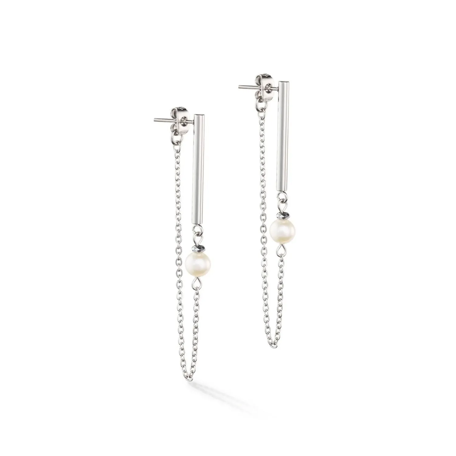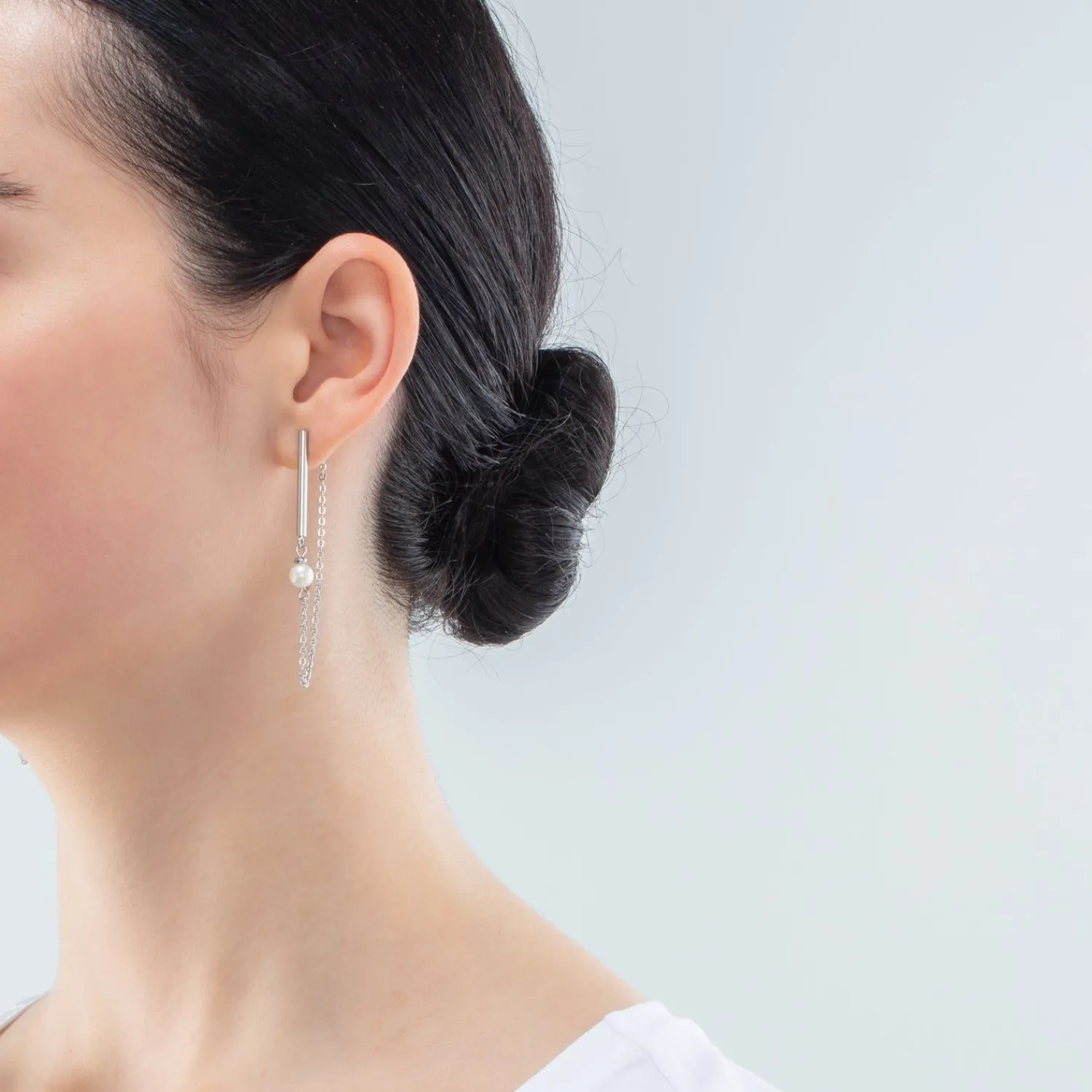 Klassische Materialien in ungewöhnlichem Design. Atemberaubende Kettenohrringe aus Silber mit einer Solitär-Süßwasserperle. Wie üblich sind eine passende Halskette und ein passendes Armband erhältlich