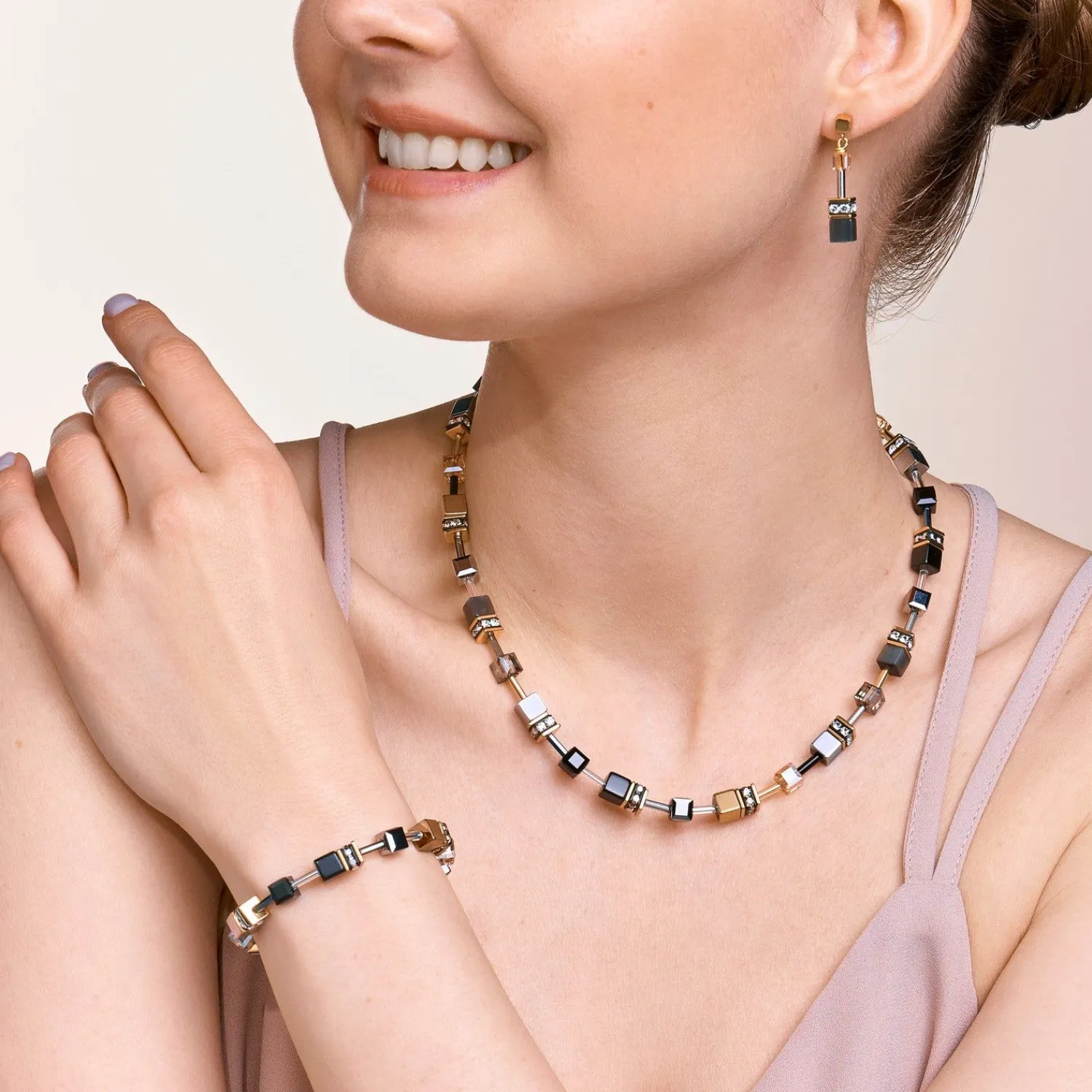 Armband aus goldfarbenem Edelstahl und Natursteinen im berühmten Geocube®-Design für einen auffälligen, glamourösen Look.