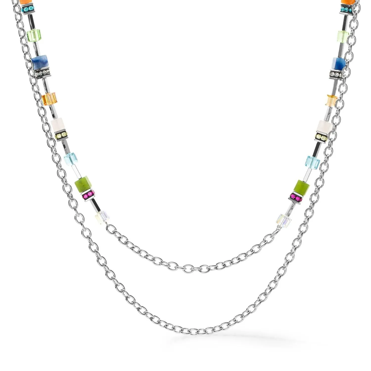 Die silberne und mehrfarbige Geocube® Iconic Boho-Halskette vereint klassische Geocube®-Perlen aus Natursteinen und eine moderne Kette. Diese schicke, böhmische Halskette ist Teil der Multiwear-Kollektion und kann als kurze, doppelsträngige Halskette für einen Lagenlook oder als zwei separate Ketten getragen werden. Alternativ können Sie die Kette und die Geocube®-Halskette zusammenstecken, um eine lange Halskette zu erhalten. Dies bietet Ihnen eine Reihe von Styling-Optionen und ermöglicht es Ihnen, den Look je nach Stimmung und Outfit zu ändern. Drücken Sie Ihre Freiheit, Kreativität und Persönlichkeit mit dieser Halskette aus.
