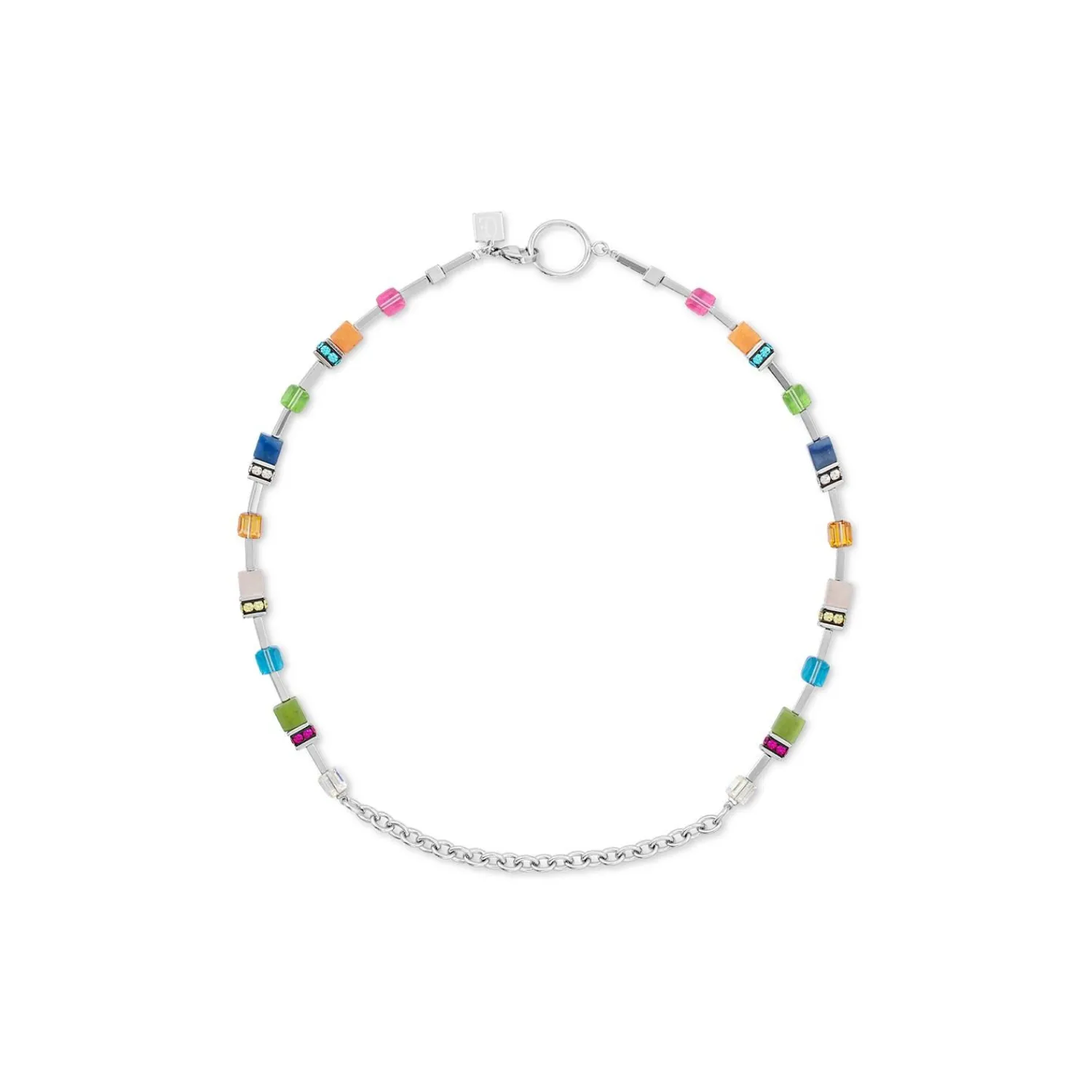 Die silberne und mehrfarbige Geocube® Iconic Boho-Halskette vereint klassische Geocube®-Perlen aus Natursteinen und ei…