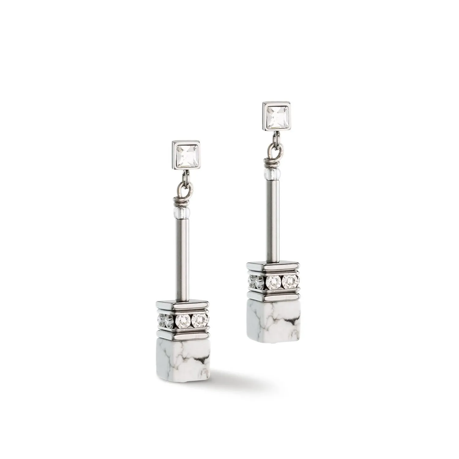 Atemberaubende Geocube®-Ohrringe mit einem Howlith-Würfel und funkelnden Kristallen. Mit oder ohne passendem Armband und Halskette getragen, werden sie garantiert alle Blicke auf sich ziehen.