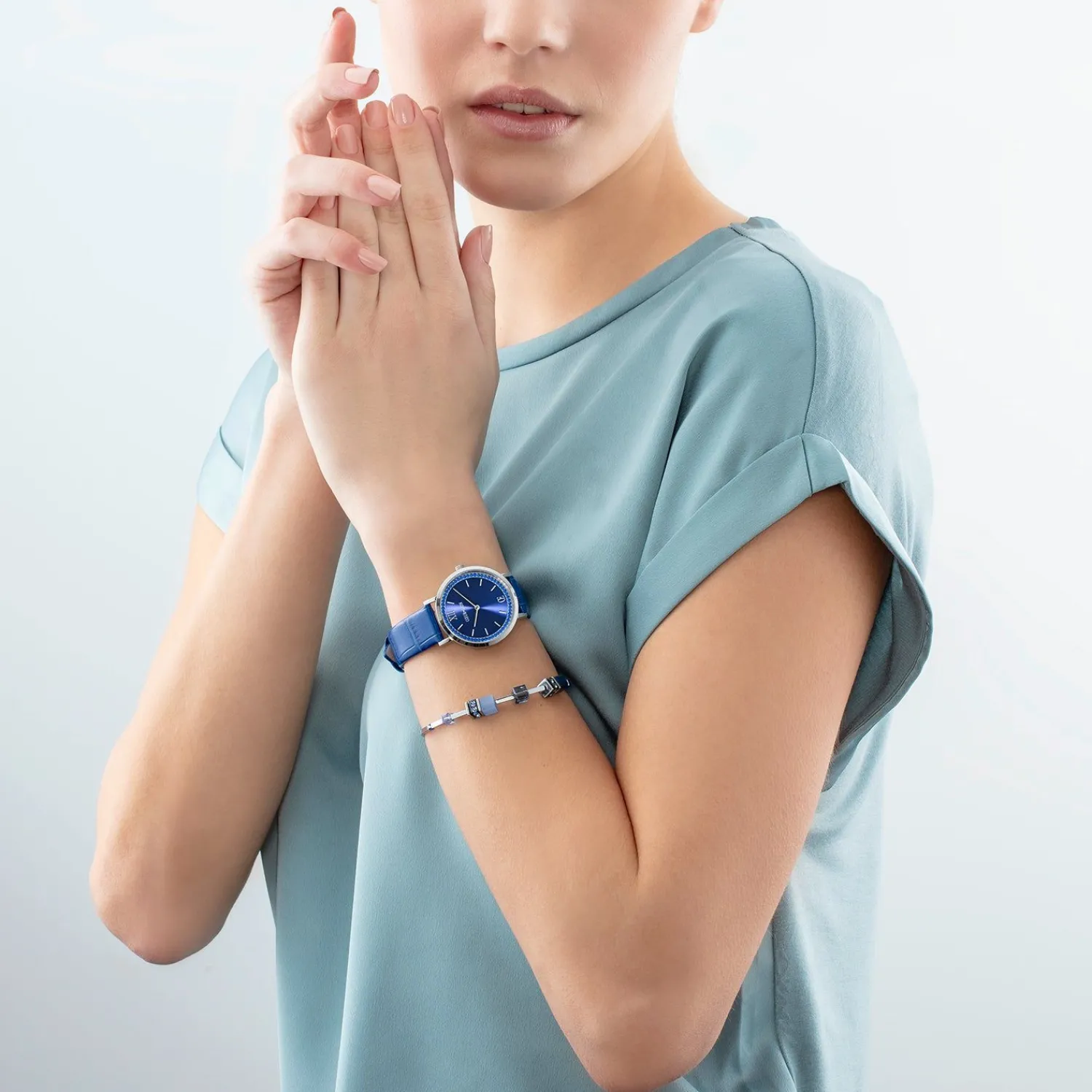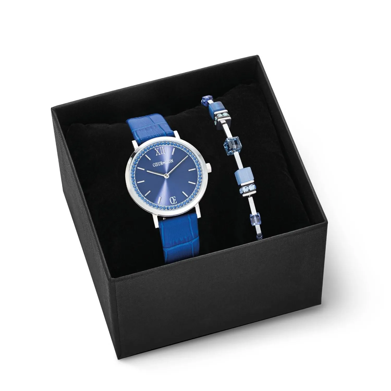 COEUR DE LION Geschenkset: Uhr Round Sparkling Sunray Royal Blue & Geocube® Iconic Lite Armband Blau- Uhren