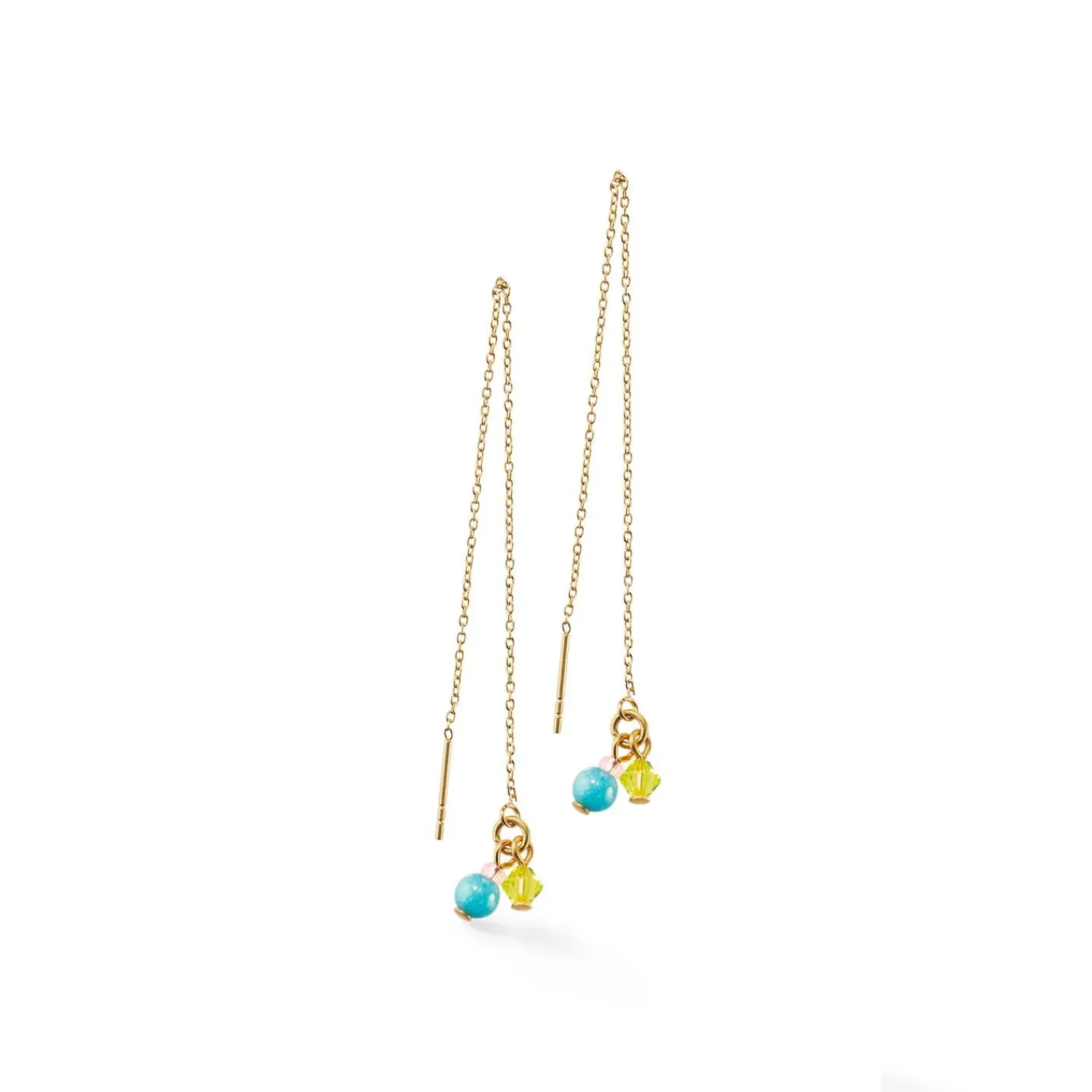 Zarte Kettenohrringe mit Amazonit- und Kristallanhängern.