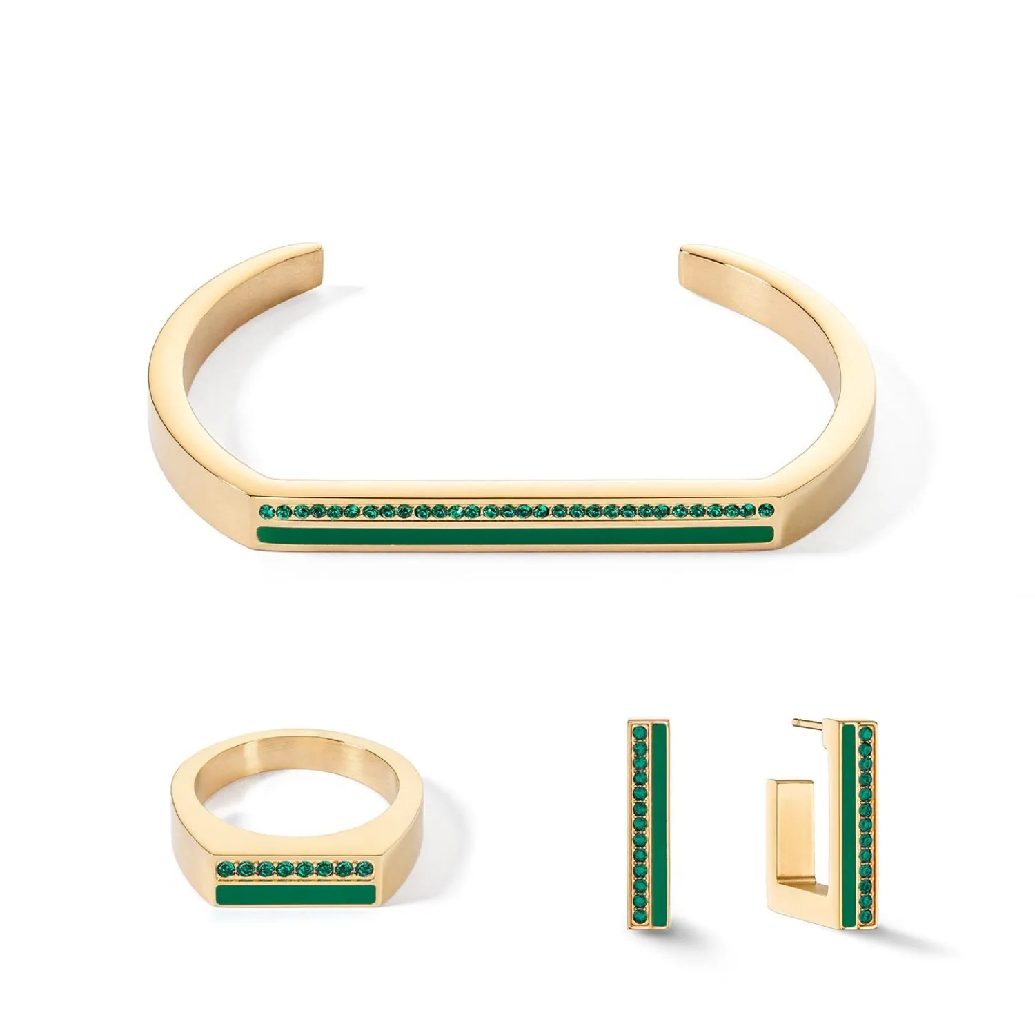 Sind Sie bereit für einen auffälligen Schmucktrend? Unsere quadratischen Edelstahl-Creolen in Gold und Grün sind ein absolutes Muss für alle Modebewussten da draußen. Mit einer aufregenden Kombination aus leuchtenden Kristallen und farblich abgestimmten Streifen verleihen diese Ohrringe Ihrem Outfit einen frischen, modernen Look. Passender Armreif und Ringe erhältlich.