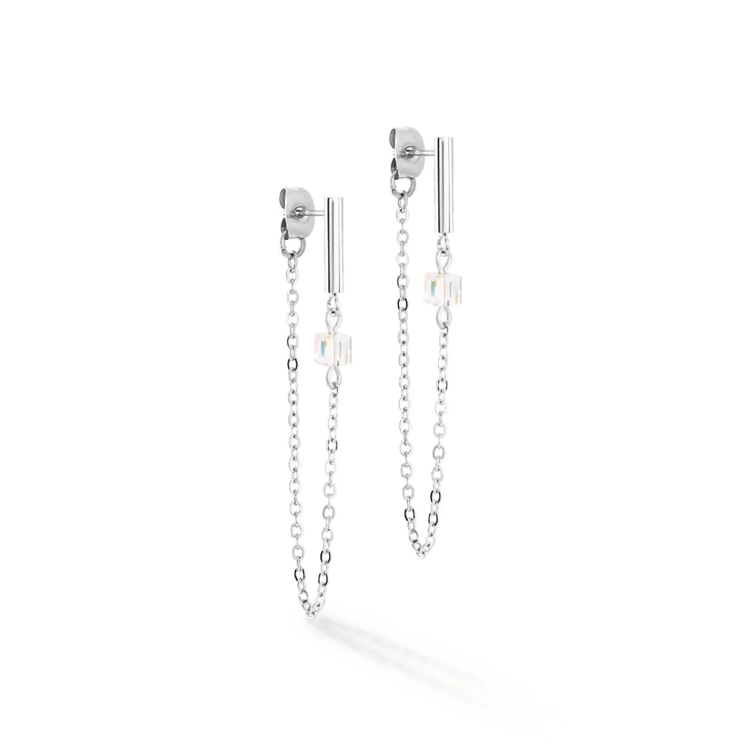 Die Mini CubesKettenohrringe in Silber und Weiß sind moderne Ohrringe im Schleifendesign.