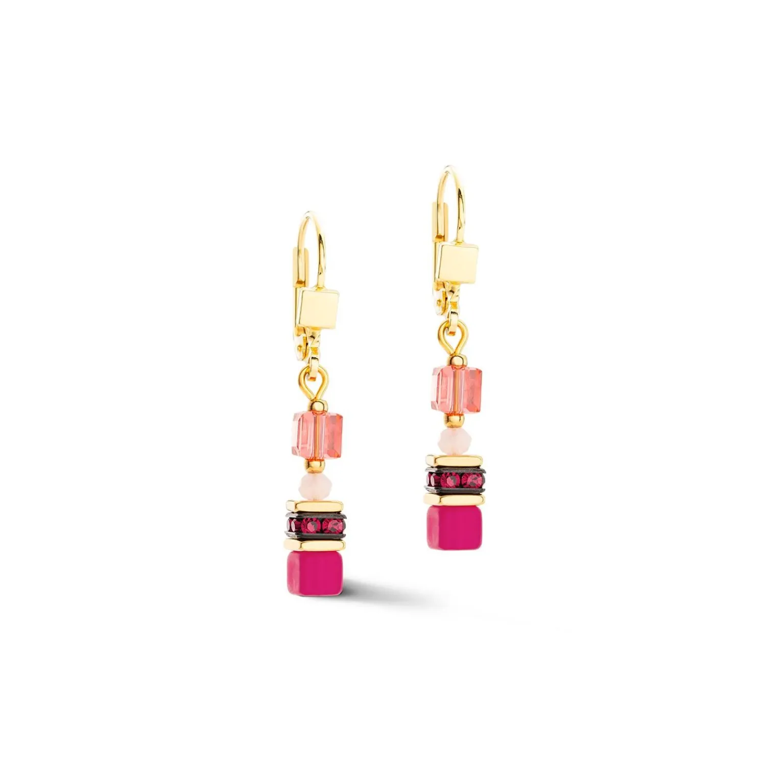 Viva Magenta! Ohrringe im Mini-Würfel-Design. Ergänzen Sie die aktuelle Mode perfekt mit den Farben Gold und Magenta.