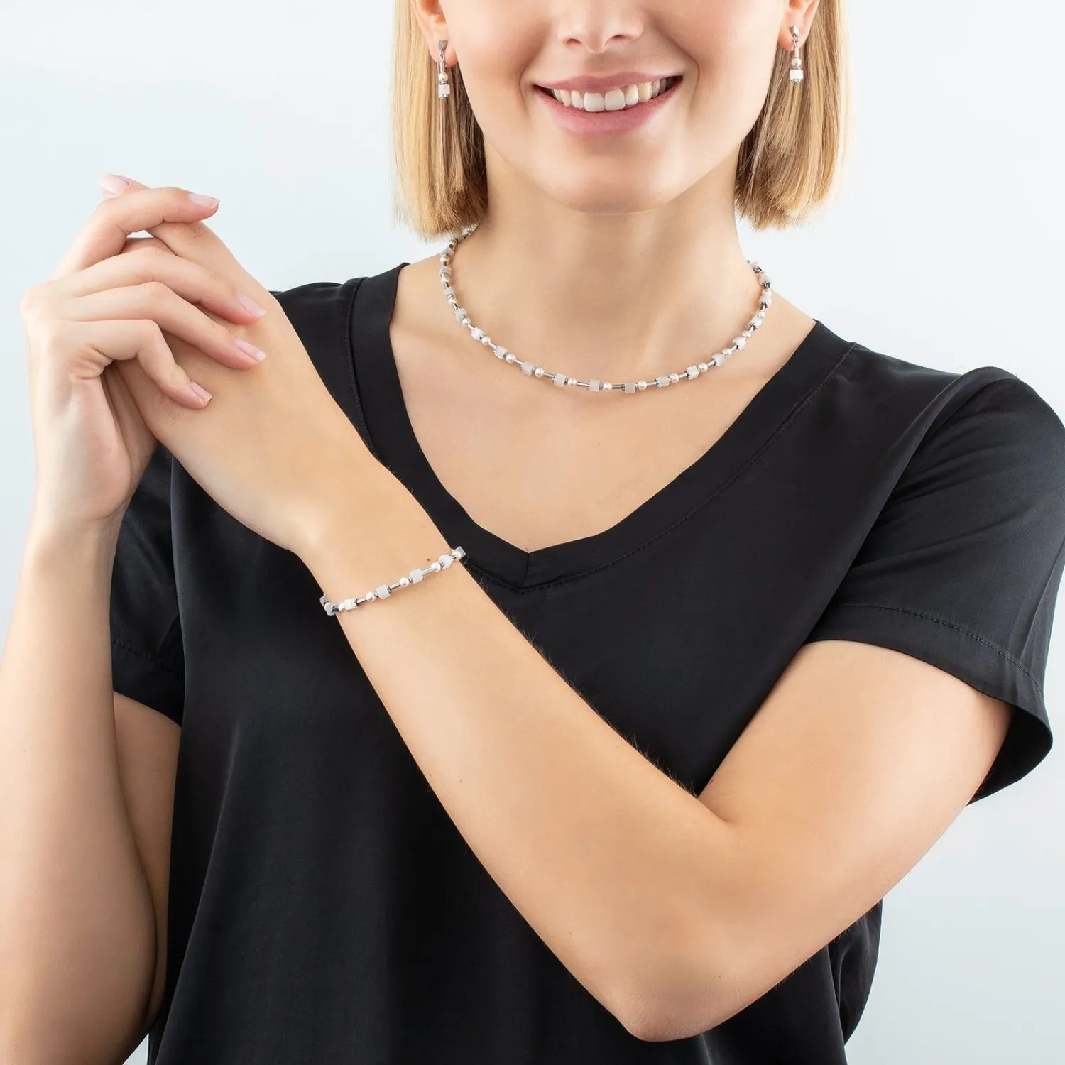 Zarte Ohrringe in Würfelform Perlen-Mix-Design. Weiße Miniwürfel und feine Kristallperlen ergeben zusammen ein leichtes Ton-in-Ton-Schmuckstück für jeden Tag.