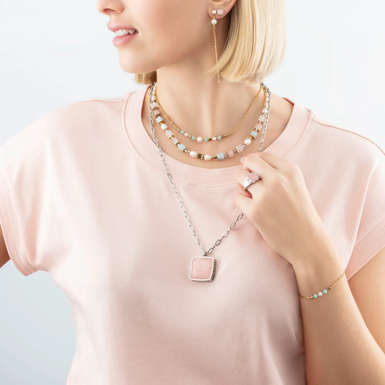 Für noch mehr Kombinationsmöglichkeiten – aber auch perfekt zum Alleintragen – bieten wir weitere Ohrstecker wie die Spikes Square Rose Quartz Silver-Pink Ohrringe aus der Spikes Square Line an. Um den Look zu vervollständigen, ist auch der passende Ring erhältlich.