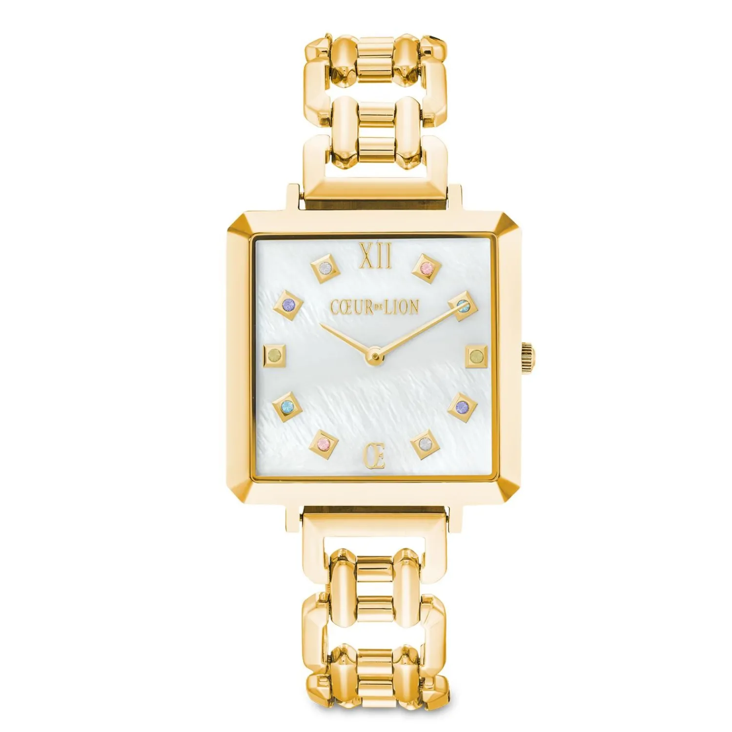Ein Uhrendesign für goldene Momente. Das Zifferblatt, das in einem warmen Perlmuttglanz schimmert, und die feinen Würfelapplikationen, besetzt mit Kristallen in zarten, harmonisch aufeinander abgestimmten Pastellfarben, harmonieren elegant mit einem hochwertigen Gehäuse und Gliederarmband aus goldenem Edelstahl. Ob allein getragen oder mit dem Coeur De Lion Pearl Edition-Schmuck mit echten Süßwasserperlen ergänzt, dieses Modell garantiert einen glamourösen Look. Die Uhr verfügt über ein hochwertiges 316L-Edelstahlgehäuse mit Abmessungen von 32 × 32 mm und einer Gehäusehöhe von nur 7,5–7,8 mm. Es verfügt außerdem über ein hochwertiges japanisches Quarzwerk mit einer 1,55-V-Batterie (3 Jahre Lebensdauer). Hochwertige Gelbgold-Ionenbeschichtung. Leicht verstellbares Edelstahlarmband mit facettierten Metallgliedern. Der Schnellverschlussmechanismus erleichtert das Wechseln des Armbands.