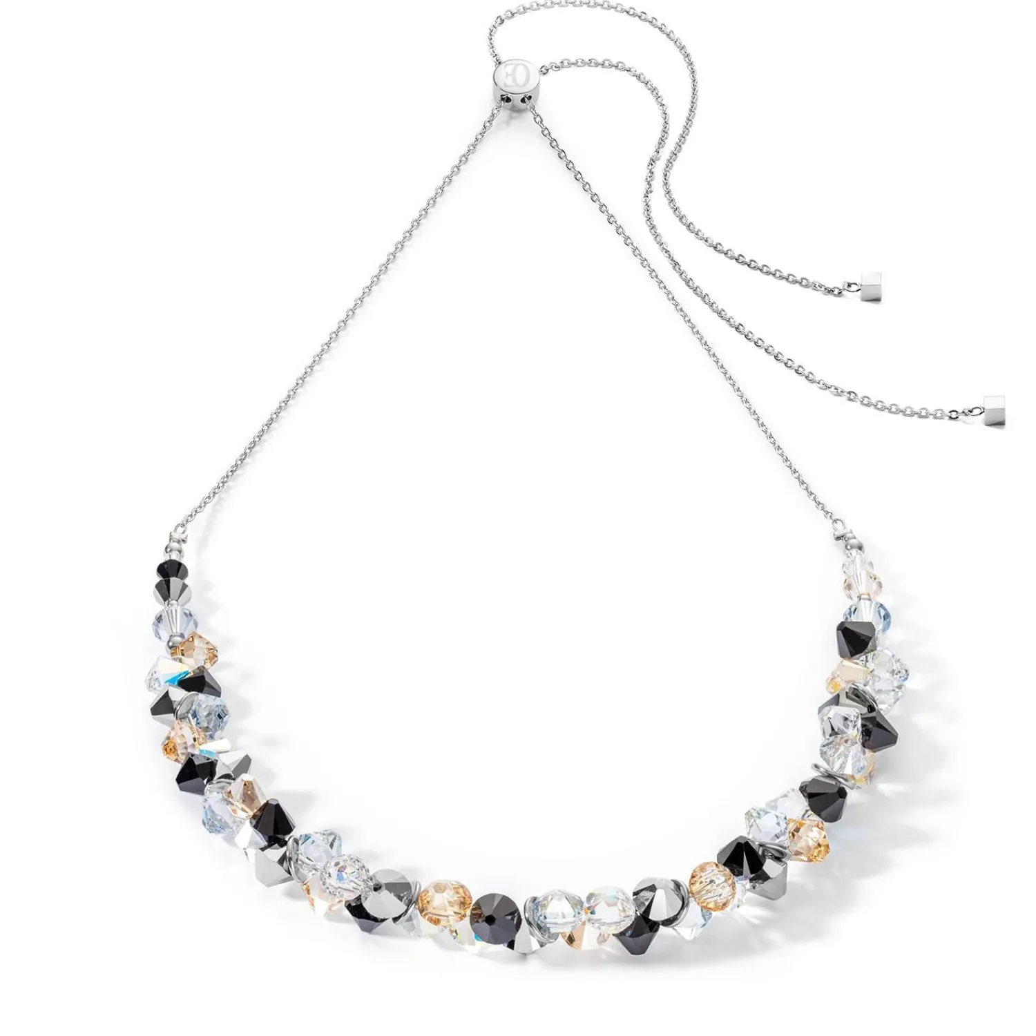 Tanzende Kristalle in Schwarz/Silber. Eine sensationelle Kombination aus funkelnden Kristallen und einer Silberkette mit einem längenverstellbaren Schiebeverschluss, der jedes Dekolleté perfekt in Szene setzt.